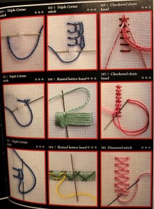From the back jacket: “Includes many heretofore unknown stitches: ancient Chinese embroidery, complex stitches from the Middle Ages, fanciful work from the sixteenth and seventeenth centuries, as well as representative needlework from American Indians.”
