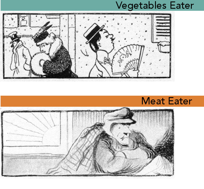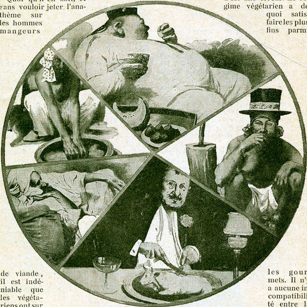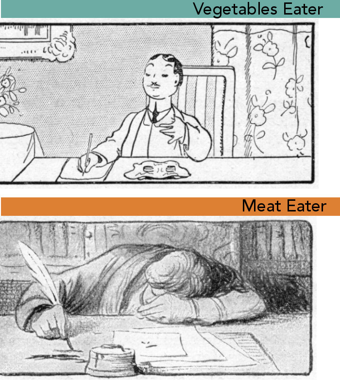 The humourous illustrations for the vegetarians are by Benjamin Rabier and the ones for the meat-eaters by Lucien Mรฉtivet. I couldnโt decipher the signature in the pie chart of the world vegetarian population as it was believed to be at the time.