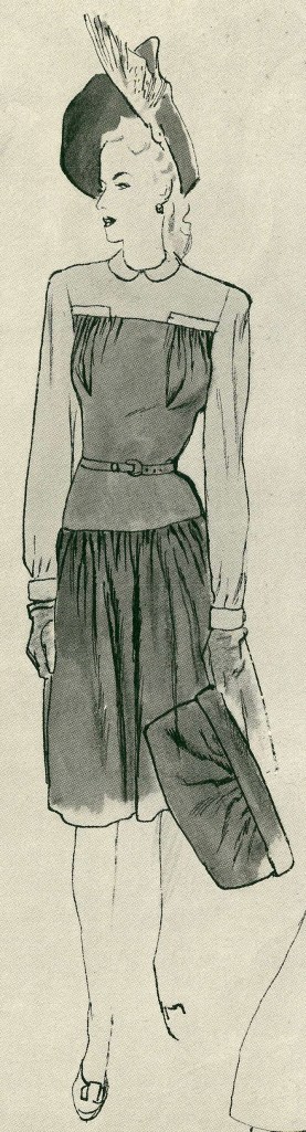 Often I’ll use only a portion of a vintage garment I see in an old magazine or movie, a detail that catches my eye. The 1941 dress below is one such garment. At the time I wanted a dress, yes, but short sleeves and light enough that I could wear with a matching shirt, cardigan, jacket. I still wanted the whole ensemble to appear as if it belongs together.